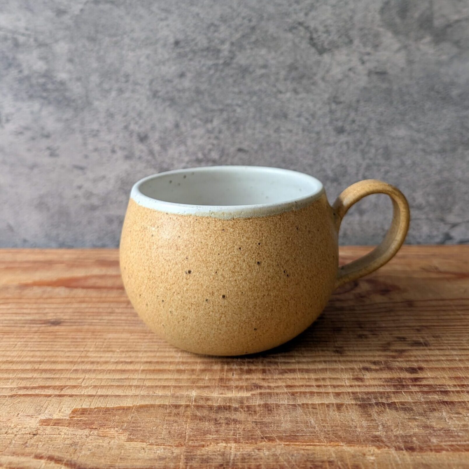 A curvy, stoneware mug in a satin, yellow glaze and satin, white glaze on the inside.