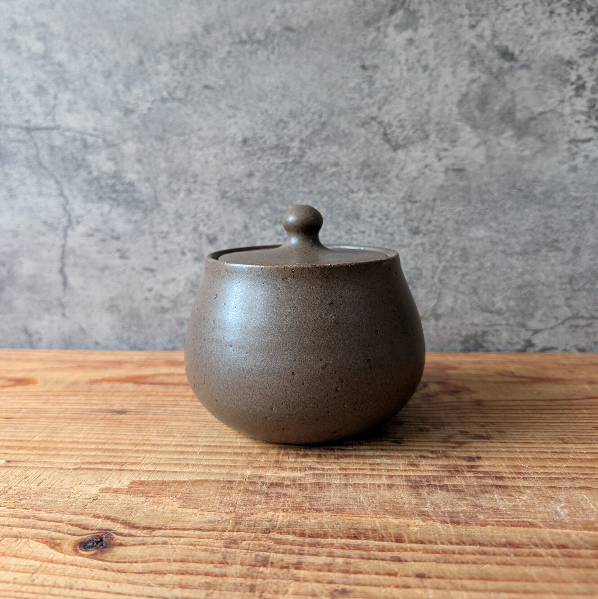 A stoneware jar in a satin, dark brown glaze with a satin, white glaze inside. This is the perfect sugar bowl.
