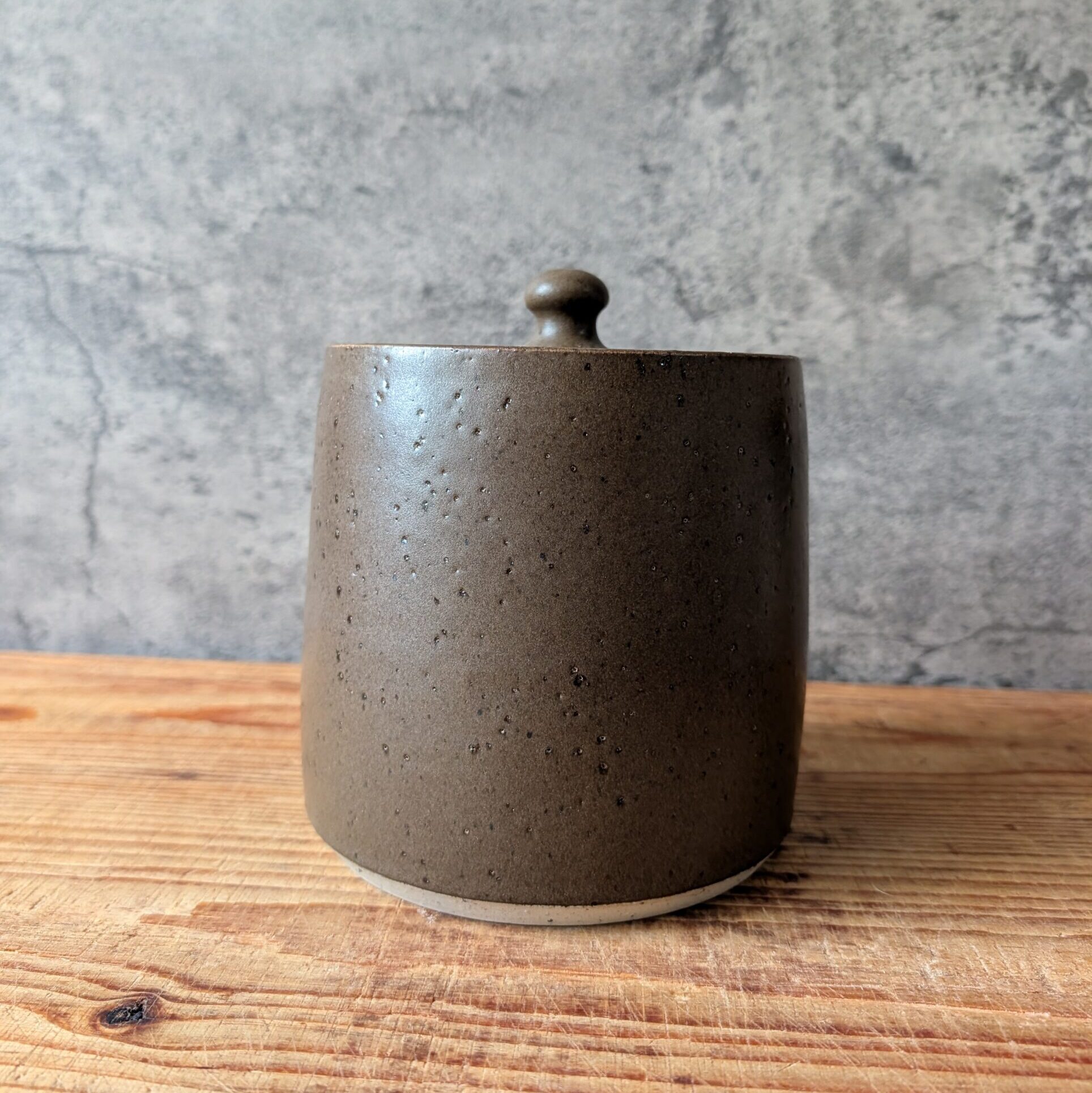 A large stoneware jar in a satin, dark brown glaze with a satin, white glaze inside.