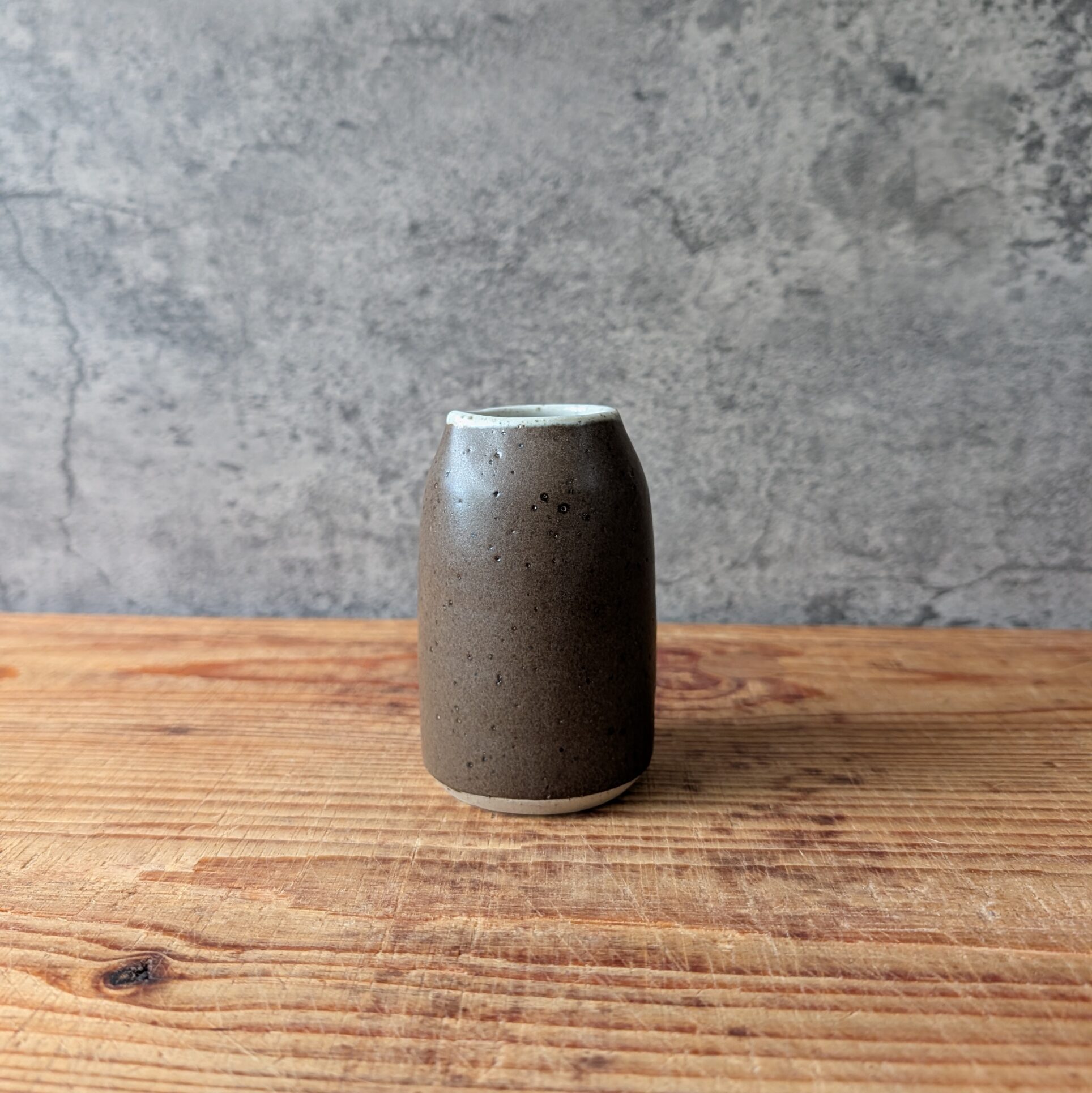 A small stoneware jug in a satin, dark brown glaze with a satin, white glaze inside.