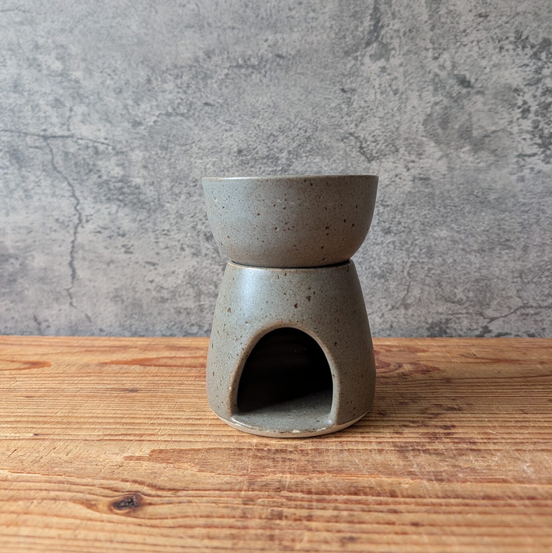 A two part, stoneware oil burner in a satin, soft grey glaze. The top bowl is very generous to hold your water and essential oil or wax melt.