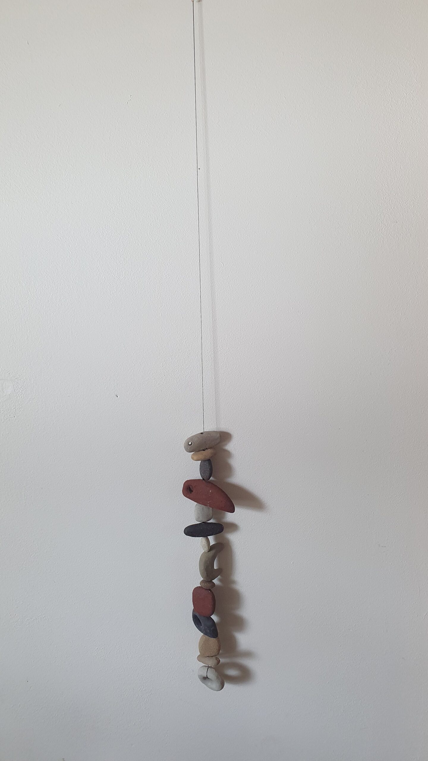 Nature inspired mobile of pebbles made out of different clay types, strung up on marine grade stainless steel wire. Perfect for inside or outside.